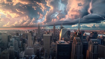 Dramatic cityscape with lightning and stormy sky