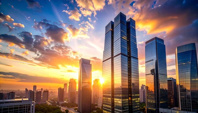 A panoramic aerial shot captures a cityscape at sunset. Glass skyscrapers reflect sunlight, set against a vibrant sky with clouds