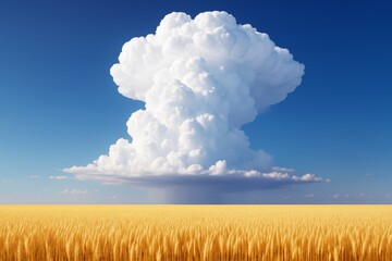 Enormous white cloud resembling explosion above golden wheat field under deep blue sky in surreal light background, concept of abstract nature power. Ai generative