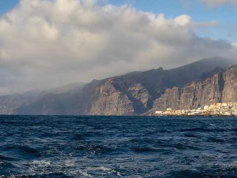 View of the colossal cliffs rise majestically from the deep blue sea, the dramatic contrast between the rugged coastline and the serene waters, Acantilados de Los Gigantes, Tenerife, Spain.
