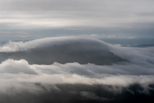 Aerial view of misty mountain range with cloud cover