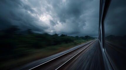 View from a moving train through a blurred landscape under a dark stormy sky