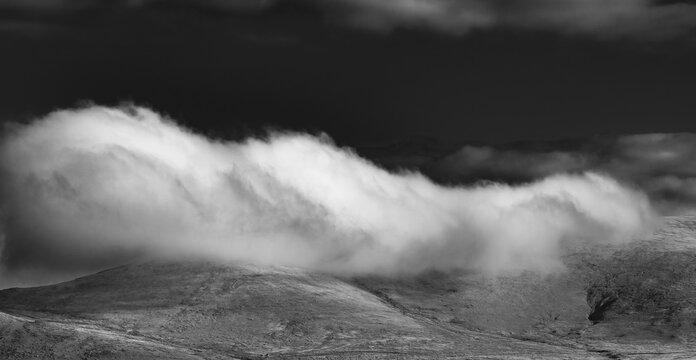 Rolling cloud drapes over mountain ridge in dramatic black and white