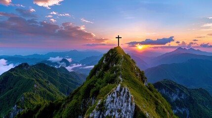 Serene Sunset Over Mountain Peak with Cross Silhouette in Vibrant Sky