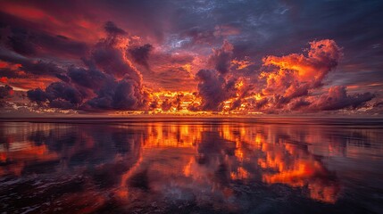 Ocean Sunset Serenity: Captivating scene of a fiery sunset over a tranquil ocean, evoking a sense of peace. Golden hues paint the sky, casting a warm glow upon the gentle waves and serene horizon.