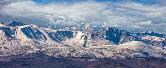 Scenic panoramic aerial view of snowy mountain peaks and slopes of North Chuyskiy ridge. Beautiful cloudy blue sky as a background. Altai mountains, Siberia, Russia