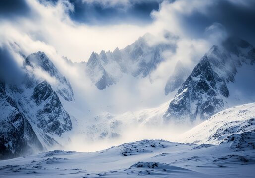 Snowy mountain peaks shrouded in mist and clouds create a dramatic winter landscape scene view cold scenery