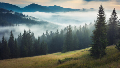 A breathtaking view of a mist-covered forest at sunrise, showcasing rolling hills, a dramatic cloudy sky, and pine trees surrounded by lush green grass and mountains in the background.