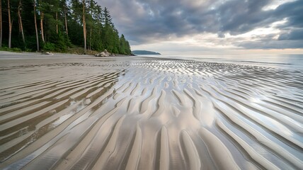 Beach at low tide with sand ripples and pine trees under a dramatic sky water ocean