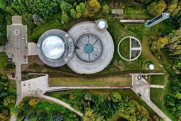 Aerial panorama of planetarium observatory and stadium in forest landscape under dramatic cloudy sky Silesian Park Katowice Chorzow Poland moody atmospheric autumn scene