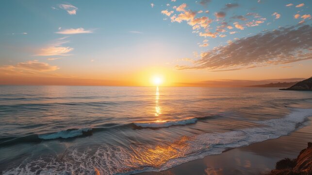 A beautiful sunset over the ocean with a rainbow in the sky. The sky is filled with clouds and the water is calm. The beach is empty and the waves are small