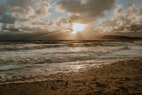 Dramatic Cloudy Sky Over An Empty Beach At Dawn Images