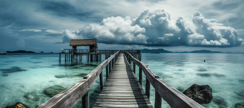 Rustic wooden pier extending over calm ocean under dramatic sky