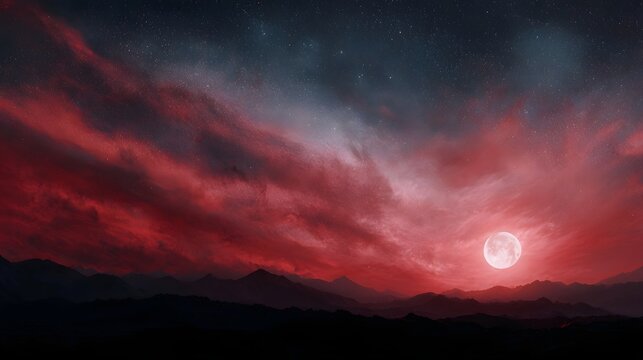 Dramatic night sky with a full moon crimson clouds and starry expanse over silhouetted mountain ranges