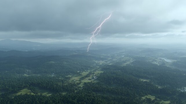 Dramatic Lightning Strike Over Lush Green Landscape Under Dark Stormy Clouds with Mountain Range in the Background