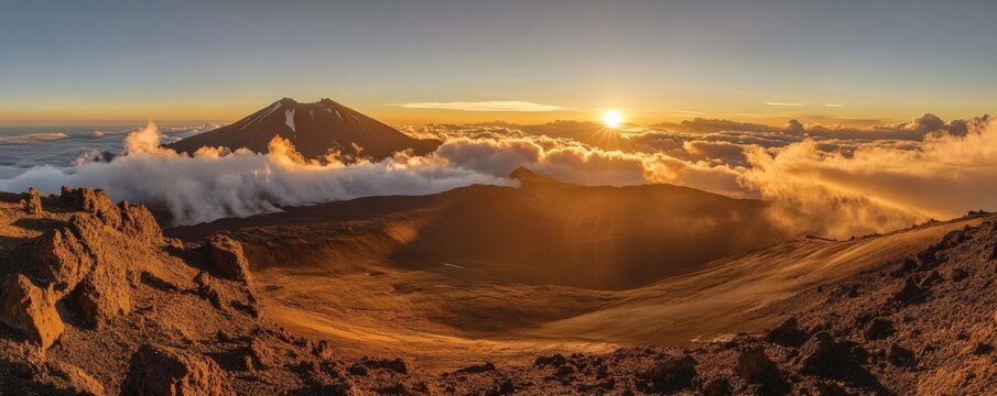 A dramatic sunrise over a mountain range with cloudy landscape