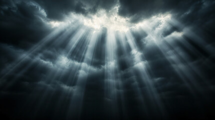 Heavenly sun rays breaking through dark clouds in a dramatic sky.