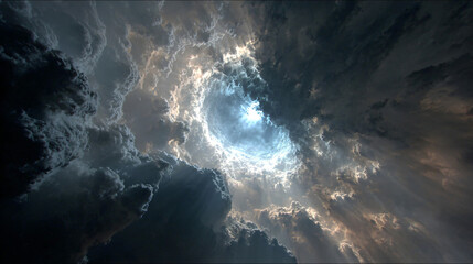 Bright light breaking through dark storm clouds creating a dramatic tunnel effect. Hope and breakthrough concept for new beginning.