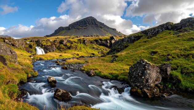 Serene landscape showcasing a meandering stream flowing through verdant grasslands towards a majestic, dark-colored mountain under a partly cloudy sky