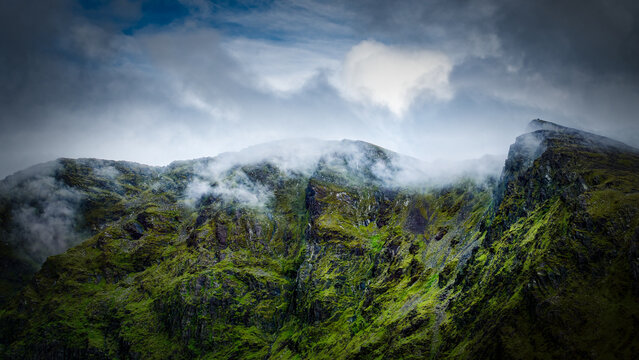 Lush green mountain face disappearing into the low-hanging clouds conveys a sense of mystery and the raw beauty of the wilderness.
