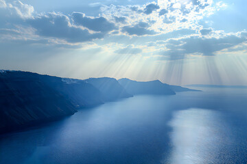 Ocean view with sun rays beaming through clouds over blue water and scenic coastal cliffs, perfect for nature lovers, travel inspiration, and peaceful landscape visuals