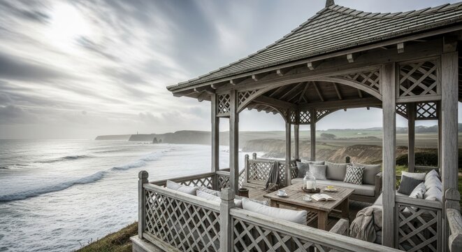 Tranquil wooden gazebo with comfortable seating and cushions offers a serene coastal view, overlooking the expansive ocean waves and dramatic cliffs under a cloudy sky, inviting relaxation.