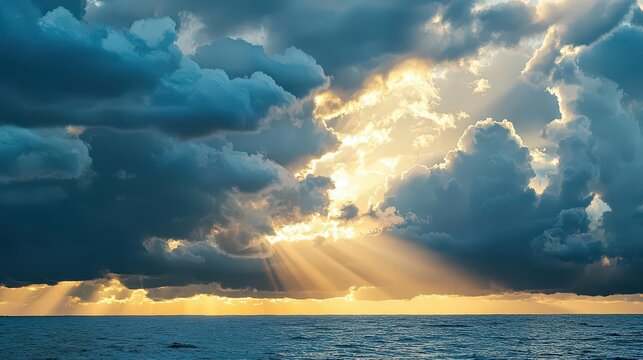 Sunlight rays breaking through clouds over calm ocean, dramatic seascape sunrise or sunset, peaceful nature background, divine light concept, heaven and hope inspiration