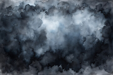 Watercolor painting of a dramatic and moody sky filled with dark, swirling clouds, creating a sense of impending storm and atmospheric depth, isolated on white background