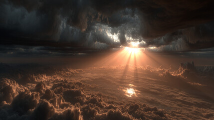 Dramatic sunlight bursts through dark storm clouds above a sea of fluffy white clouds, creating a peaceful yet powerful and ethereal atmosphere above the world.
