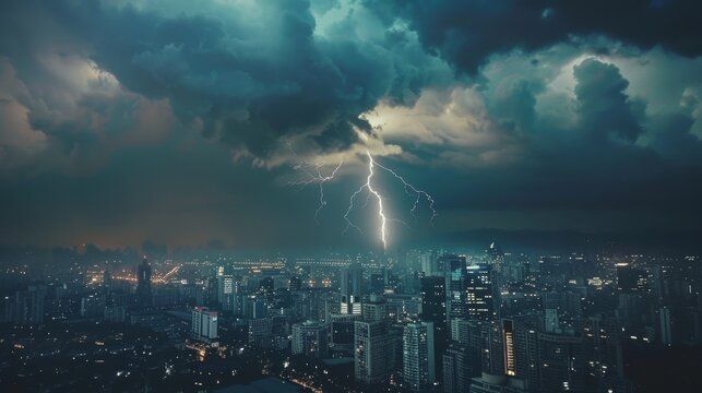 Dramatic lightning storm over city skyline with dark clouds and illuminated buildings