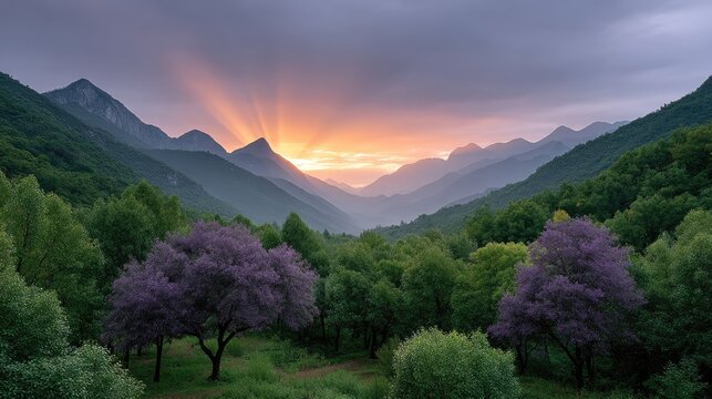 Dramatic sunrays breaking through clouds over misty mountain forests