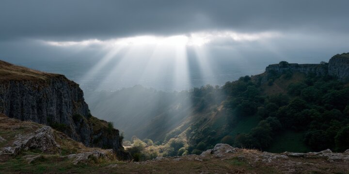 Dramatic landscape with sunrays breaking through clouds over valley
