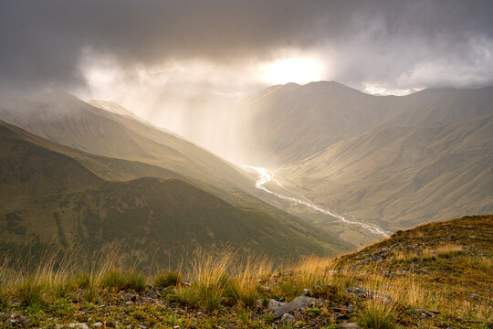 Dramatic Landscape With Sunrays Breaking Through Clouds Over Valley Images