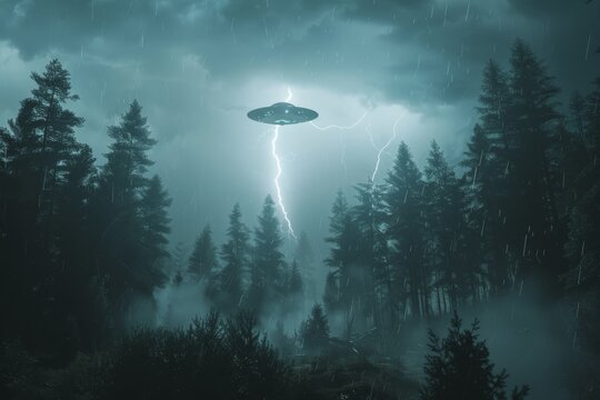 An enigmatic UFO is seen floating over a forest landscape as a bolt of lightning strikes, illuminating the dramatic night sky creating an atmosphere of mystery and intrigue.