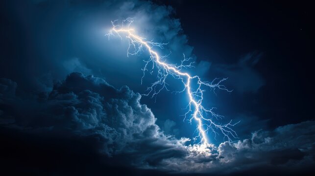 Lightning bolt cutting through dark storm clouds in a dramatic night sky capturing the raw power of nature and extreme weather conditions perfect for stock photography and natural background visuals.