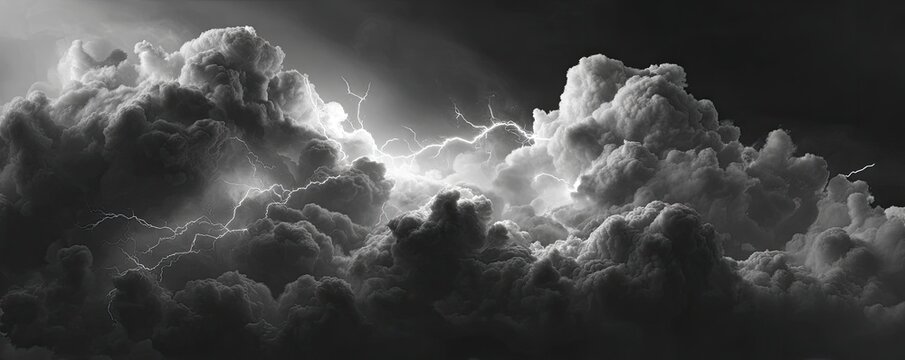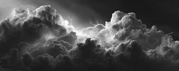 Dramatic monochrome image of lightning flashing through billowing dark clouds