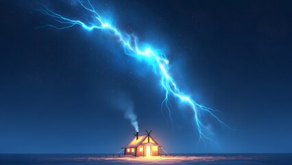 Dramatic lightning strike illuminating stormy dark clouds over a house rooftop at night with intense electric energy