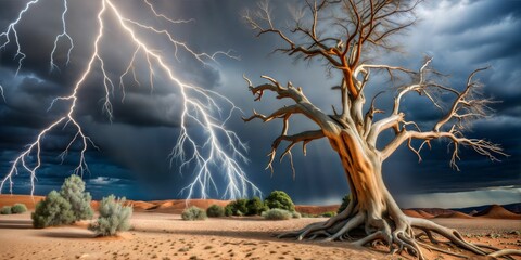 A dramatic display of a lightning storm over a desert landscape, angled shot, Dramatic style