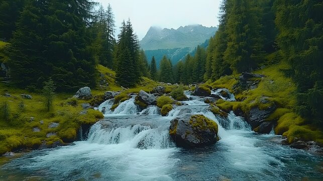 Wild mountain river with rushing water flowing over boulders and steep hillsides