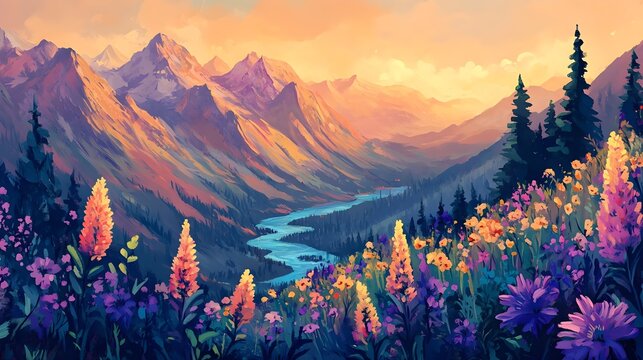 Majestic sunset over a vast mountain valley, showcasing towering cliffs and a dense evergreen forest. The golden hour light paints the landscape in warm hues, creating a breathtaking scene.