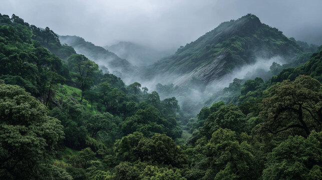 Serene view of a lush green forest in a mountain valley covered with morning mist and fog