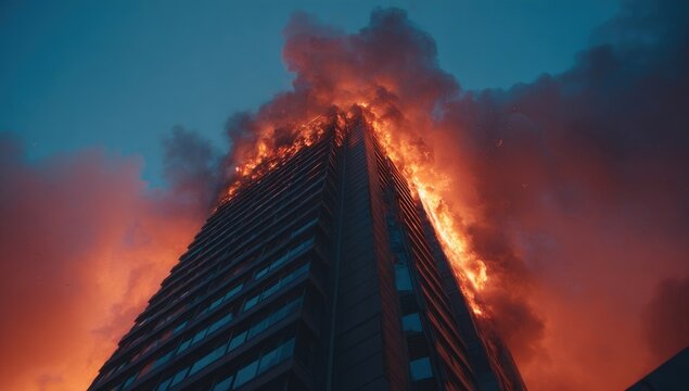 High-rise building engulfed in flames, billowing smoke against a dramatic twilight sky