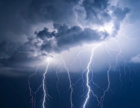 A mesmerizing electric lighting effect radiates against a dark, mysterious black background, evoking the intense energy of a stormy night, with bold, vibrant lightning bolts of electric blue and white