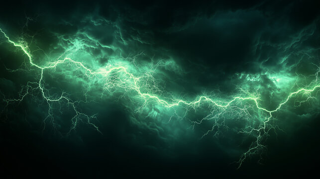 Dramatic green lightning storm in dark turbulent sky at night