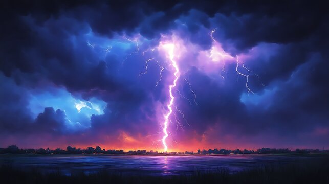 A dramatic, powerful lightning bolt striking the ground during a nighttime thunderstorm The vibrant flash illuminates the dark landscape with intense light , natural disaster, thunder
