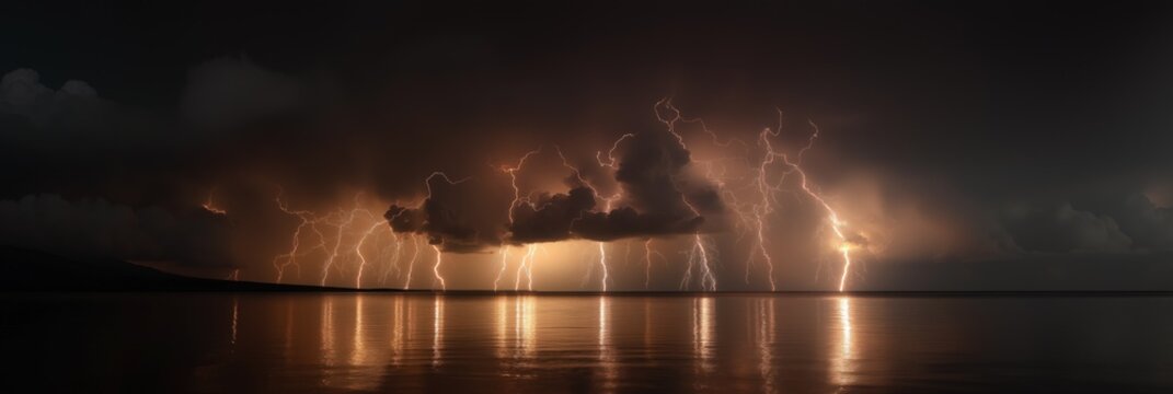 Lightning bolts are illuminating a dramatic stormy sky full of dark clouds, creating a powerful and intense atmosphere