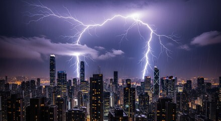 Spectacular thunderstorm with bright flashes and heavy rain in nocturnal urban scene