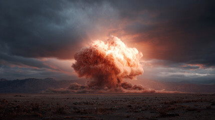 Nuclear explosion with a massive mushroom cloud rising above dark stormy skies, illuminating the horizon with a fiery glow, symbolizing destruction and power in a dramatic landscape