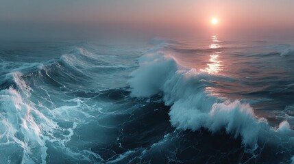 Dramatic ocean waves crash under a hazy, pastel sunset sky