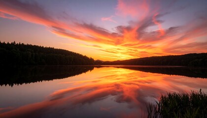 A dramatic nature landscape features a sunset over the lake and forest where fiery light reflects like fire in the water under a stormy sky and orange cloudsA dramatic nature landscape features a suns